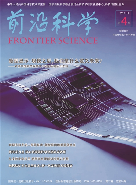 | 《前沿科学》(季刊)2025年第4期封面。本期话题聚焦新型显示与战略性电子材料研究进展和未来发展方向。该刊由国家自然科学基金委员会高技术研究发展中心与科技日报社主办。 |