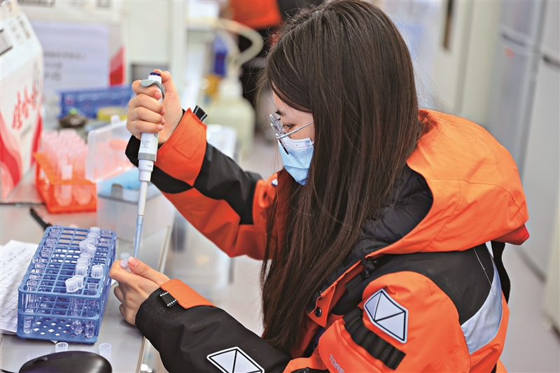 | 2026年1月22日,“雪龙2”号大洋队队员汪洪敏正在进行移液操作。 |