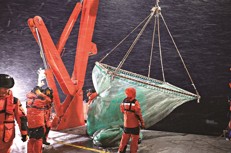 | 2026年1月22日,“雪龙2”号大洋队队员顶着风雪准备中层鱼拖网作业。 |