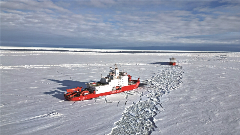 | 2025年12月5日,中山站附近,“雪龙2”号(左)为“雪龙”号破冰引航。 王斌 摄 |