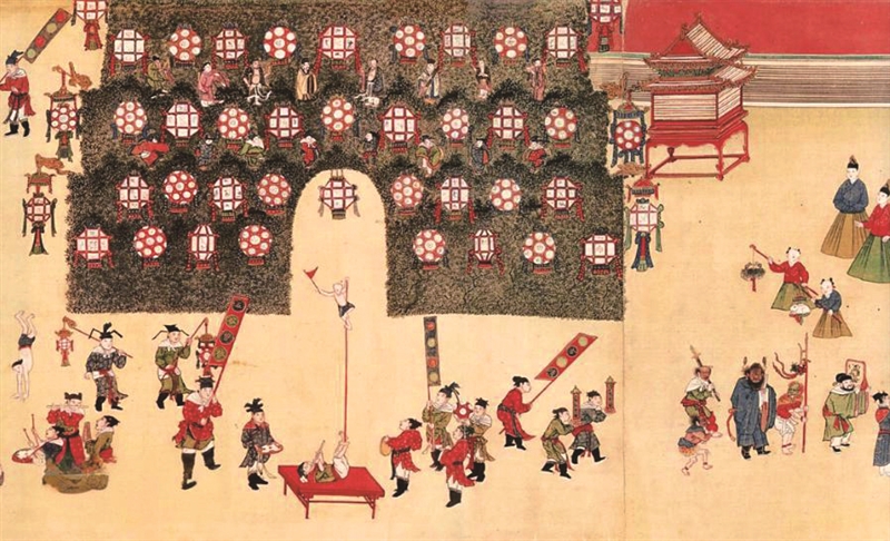 宫廷中过元宵节更热闹。明代《宪宗元宵行乐图》卷描绘的是明宪宗在皇宫庆祝元宵节的情景。只见皇宫内外张灯结彩,明宪宗身着盛装,欣赏各种精彩活动。连民间的街市都被搬进了皇宫,尽显烟火气:宫人、儿童手持鞭炮,炸开了满地碎红;货郎车上摆满各色玩具,引得人们竞相购买;杂耍艺人各显神通,钻圈、魔术、倒立……好不热闹。