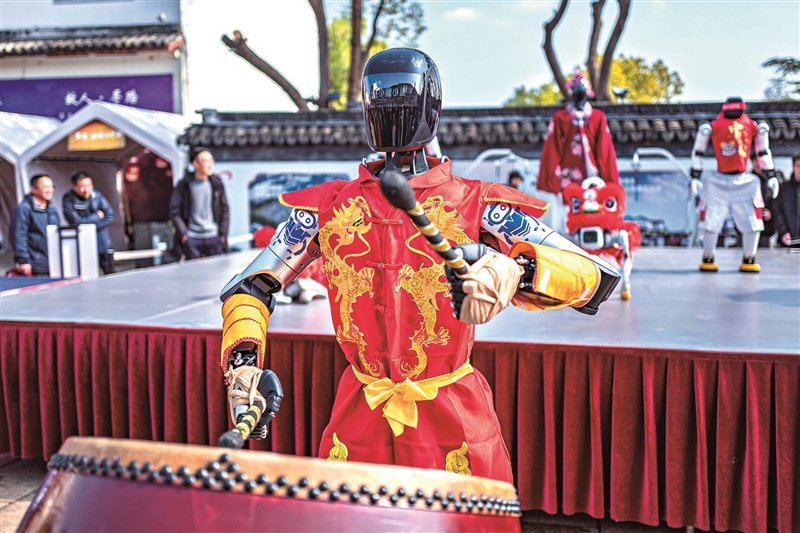 | 图③: 2月17日,江苏昆山周庄古镇,人形机器人在进行击鼓表演。视觉中国供图 |