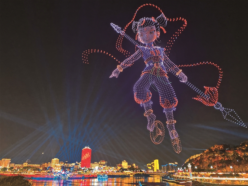 | 图④: 2月11日,四川宜宾,5000架无人机在空中变换出哪吒、大熊猫等图案,迎接马年春节。 视觉中国供图 |
