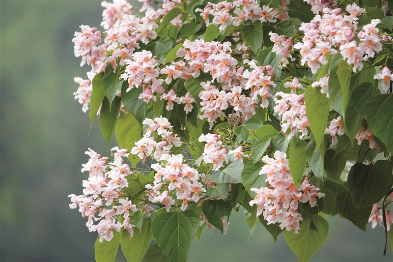 良种楸树:花期达月余。种一棵会开花的楸(qiū)树,为山河添一抹绚丽的春色。楸树是我国的乡土树种,它树姿俊秀,高大挺拔,枝繁叶茂,花期从4月中旬持续到5月中旬,花形若钟,花色从粉色至深红色,通过不同品种的搭配,可为山河铺展出层次丰富的色彩。现经过杂交育种和无性系选育等技术,选育出“中林”等系列楸树国家级良种,不仅材质优良,还耐寒性强,已在北京、河南、山东、安徽等地区推广种植。栽种在北京的良种楸树,能将当地观花期延长近20天。