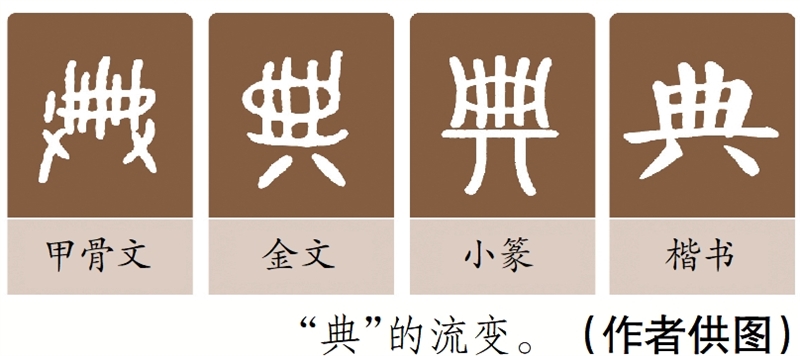 再来追溯一下“典”的起源:“典”的甲骨文很形象,就是两只手捧着一卷竹简,本义是典籍、典册。“典”不是一般的书籍,而是可以作为标准或规范的重要文献、书籍,比如字典、词典、经典。