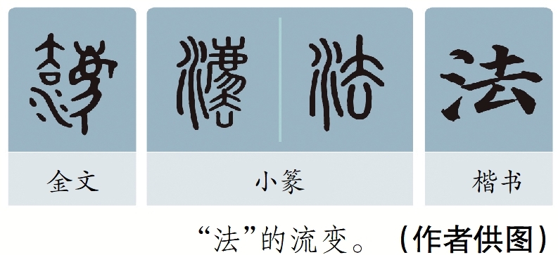 “法典”二字内涵颇深。仔细观察“法”的金文,发现其分为三部分:“水”,以示法律公正如水;“去”,意为把坏人赶出去;一只威风凛凛的神兽——廌(zhì),亦称“獬豸(xiè zhì)”,其富有正义感,能分辨是非。