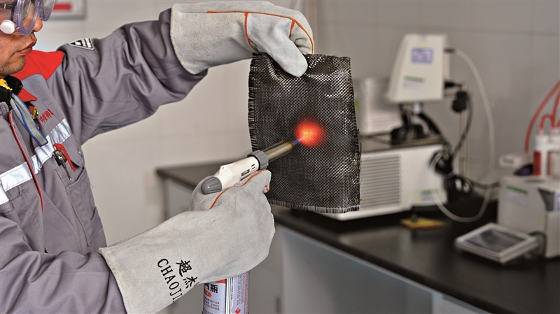 | 3月9日,工作人员用喷火枪对碳纤维进行耐高温测试。 (视频截图) |