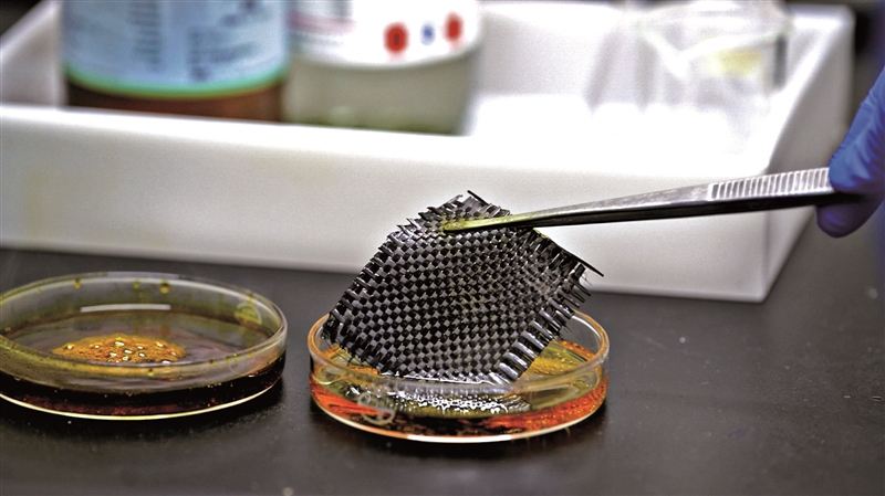 | 3月9日,科研人员对碳纤维进行耐腐蚀测试。 (视频截图) |