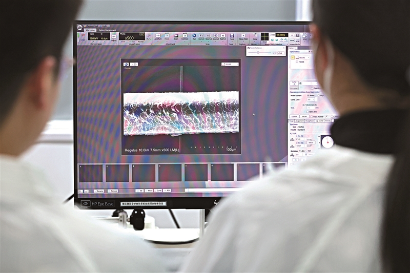 | 3月17日,科研人员通过扫描电子显微镜,进行碳纤维微观表面形貌分析。 |