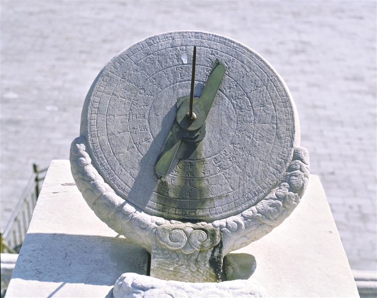 日晷(ɡuǐ)是古人利用太阳影子变化来计时的工具,由晷针和晷盘构成。晷盘平行于赤道面,晷针垂直于晷盘,上端指向北半球,下端指向南半球,晷盘正反面均刻有“子、丑、寅、卯”等十二时辰(每个时辰相当于2小时),每个时辰等分为“时初”“时正”,正好是一天的24小时。当太阳光照在日晷上时,晷针影子就会投向晷盘,晷针影子随着太阳的东升西落而移动,就像现代钟表的指针,晷盘则是钟表的表面。