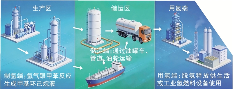 LOHC原理很简单——在制氢端,甲苯像一块海绵把氢气“吸”进分子里,变成稳定的甲基环己烷液体,相当于把氢气安全“锁”起来,这就是“加氢”。