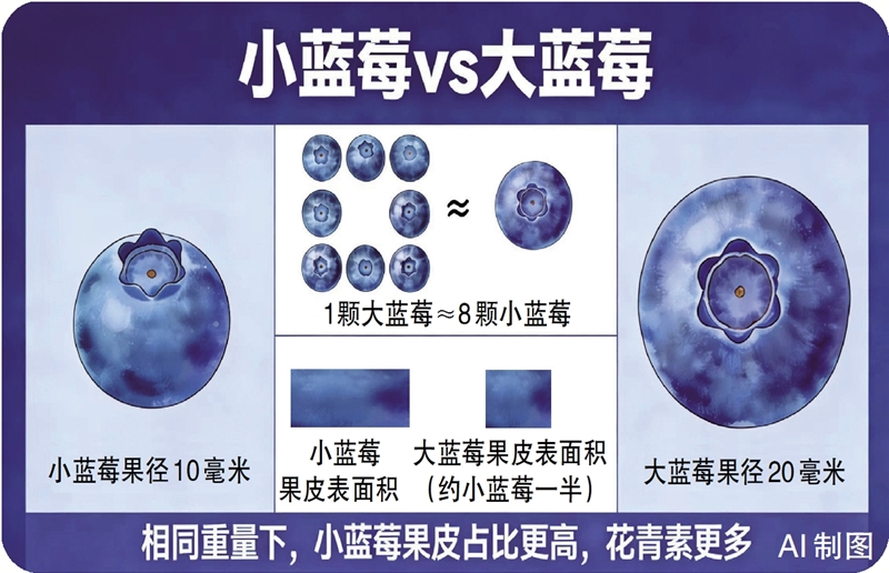 我们可以做个直观对比:同等重量下,假设小蓝莓果径10毫米、大蓝莓果径20毫米,1颗大蓝莓约等于8颗小蓝莓,但在果皮的表面积上,大蓝莓果皮的表面积却只有小蓝莓的一半。也就是说,同样重量的蓝莓,小蓝莓数量更多,我们吃到的果皮面积更大,花青素积累自然也就更多。