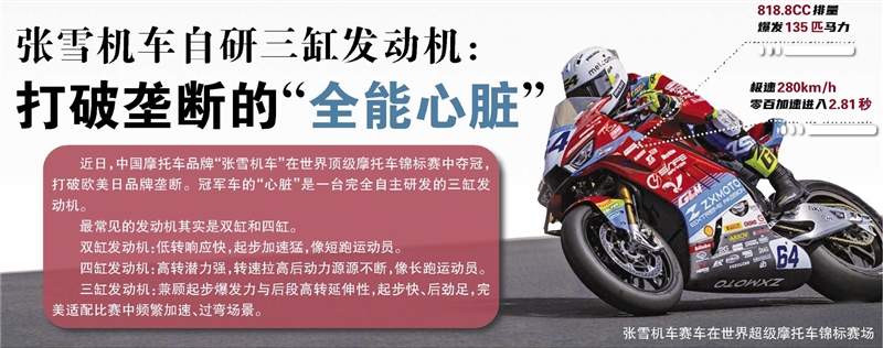 近日,中国摩托车品牌“张雪机车”在世界顶级摩托车锦标赛中夺冠,打破欧美日品牌垄断。冠军车的“心脏”是一台完全自主研发的三缸发动机。