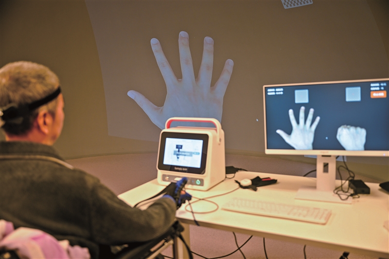 | 图①: 4月7日,在贵州省贵阳市北京积水潭医院贵州医院,患者在进行脑机接口康复训练。 |