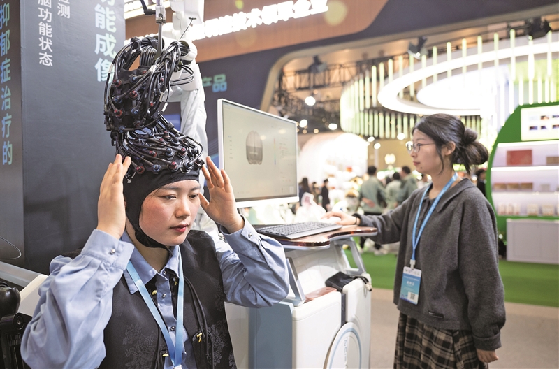 | 图②: 4月8日,2026世界大健康博览会上展示的无创脑机接口设备。视觉中国供图 |