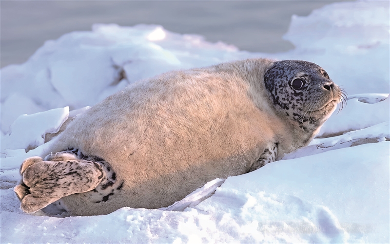 斑海豹是典型的海洋哺乳动物,与浮冰缘分深厚。每年1-2月,辽东湾冰封形成的浮冰带,便是它们繁殖、育幼的天然“产房”。刚出生的小斑海豹,体重有5-12千克,浑身裹着一层雪白蓬松的胎毛,像胖乎乎的小雪球。这身胎毛是它的“生存法宝”,能在冰面与白雪间“隐身”,躲避天敌。