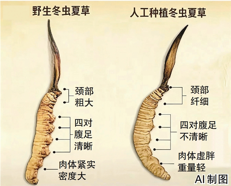 从形态上看:人工种植的冬虫夏草通常没有虫体消化腺痕迹,四对足也相对扁平。