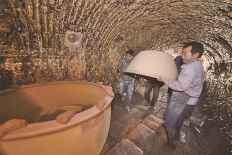 “接下来,把腐泥变成陶艺的舞台,交给把火师傅。第一道门是关键,火烧得不好,窑里缸全部都倒掉,在里头炸开裂。”年过半百的龙窑守护人孙成宏告诉笔者,虽然现在有电烧窑、煤烧窑,但是传承古法的柴烧龙窑,依然展现了不落后人的先民智慧。现场,窑工正在使用传承的泥条盘筑技艺,制作一口1.3米高的大缸。泥条盘筑,需要师傅将泥料搓成长条,按照器形要求,自下而上,盘桓塑形,最终将陶器筑造成型的一种工艺。一口大缸,从筑底到成型,整个制作周期大约需要20天。之后,缸坯再经施釉,成为半成品,待完全晾干通透后,才可装窑。