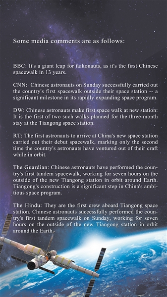 Shenzhou 12 taikonauts carried out the first extravehicular activity on July 4. It was the first time taikonauts had made a space walk in this mission, which caused many repercussions in the international media world.