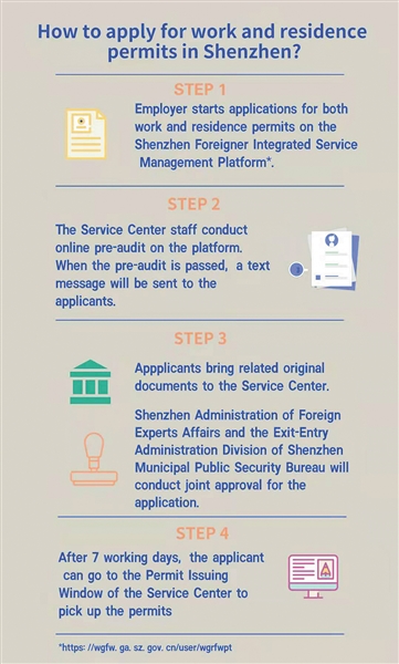 The Shenzhen Employment and Residence Service Center for Foreigners (the Service Center) was inaugurated in December 2020. The inauguration also witnessed the online operation of an integrated service management platform for foreigners, through which expats can apply for work and residence permits at the same time. The approval process has been shortened to seven working days. Below is the flow chart of application for foreigners.