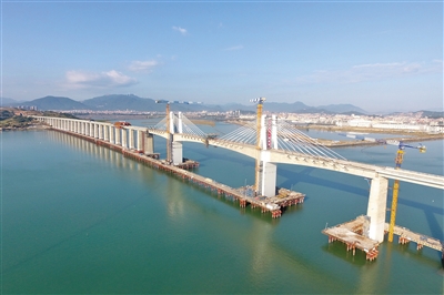 The Meizhou Bay cross-sea bridge is one of the major parts of the 277 - km Fuzhou -Xiamen HSR which is under construction. With a designed speed of 350 km per hour, the HSR is expected to slash the travel time from the province's capital Fuzhou to the tourism city of Xiamen to under an hour.