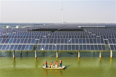 | China has been boosting green development by promoting clean energy in recent years. Electricity workers patrolling amid a photovoltaic and wind power generation project installed above the fishery waters in Baoying County of Yangzhou, Jiangsu Province. (PHOTO: XINHUA) |