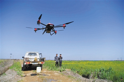 | Staff members operate a drone in the field of a smart farm in Jiangxiang town, Nanchang county of east China's Jiangxi province. (PHOTO: XINHUA) |