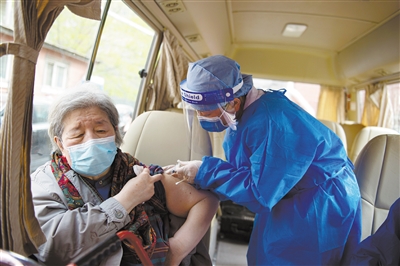| A senior citizen is receiving vaccination in a mobile vaccination vehicle. (PHOTO: XINHUA) |