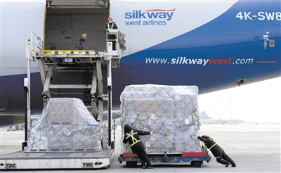 | A cargo plane of Azerbaijan's Silk Way West Airlines is loaded at an airport in central China's Zhengzhou city. (PHOTO: VCG) |
