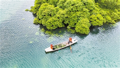 | June 5 is World Environment Day, and the theme of 2022 is "Only One Earth." Volunteers are clearing floating garbage on a reservoir in Changning, central China's Hunan province. (PHOTO: XINHUA) |