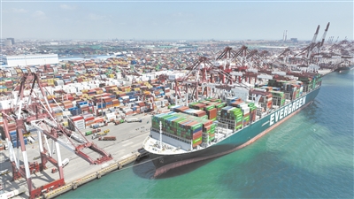 | Customs data shows that from January to May this year, east China's Qingdao port has completed a total of 830,000 TEUs to BRICS countries, a year-on-year increase of 12 percent. (PHOTO: XINHUA) |