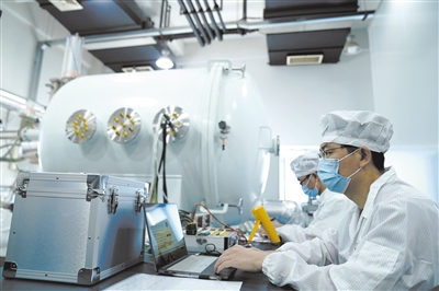 | Researchers from Shanghai Institute of Technical Physics under the Chinese Academy of Sciences analyze the simulation data of space environment in laboratory. (PHOTO: XINHUA) |