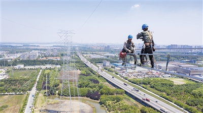 | Workers set up wires for the transmission line in Kunshan city, east China's Jiangsu province. (PHOTO: VCG) |