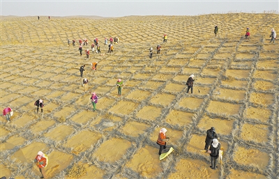 | People in Gansu province work together to combat desertification in the Tengger Desert. (PHOTO: VCG) |