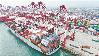 | Aerial photo shows container ships at the Qianwan Container Terminal in Qingdao port, east China's Shandong province. (PHOTO: XINHUA) |
