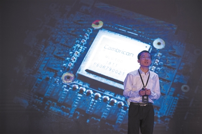 | Cambricon Technologies's CEO Chen Tianshi introduces China's first cloud artificial intelligence (AI) chip MLU100 in Shanghai, east China. (PHOTO: XINHUA) |