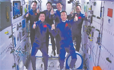 ①This simulated image shows the manned spaceship Shenzhou-15 conducting docking with the Tianhe module on November 30, 2022. ②China's Shenzhou-15 crew enter the country's space station and meet with another astronaut trio, adding the manpower at the in-orbit space lab to six for the first time. (PHOTO: XINHUA)