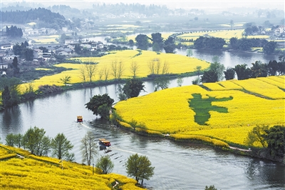 | Rapeseed flowers, grown for the production of edible vegetable oil, are in full bloom in Tongnan district, Chongqing municipality. (PHOTO: VCG) |