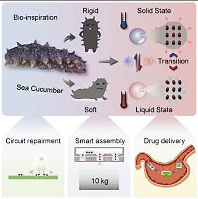 Inspired by the sea cucumber, the magneto-active phase transitional matter (MPTM) is composed of magnetic neodymium-iron-boron micro-particles embedded in liquid metal.