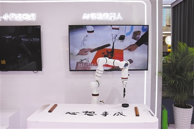 | The AI robot arm with a Chinese calligraphy brush writes Chinese characters, which read "May all your wishes come true." |