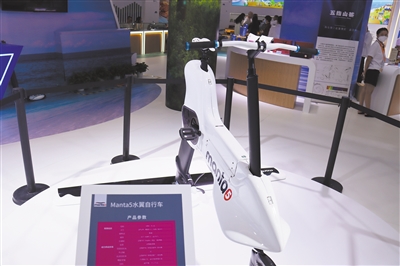 | This hydrofoil e-bike made of carbon fiber can ride on water at a speed of 20 kilometers per hour. |