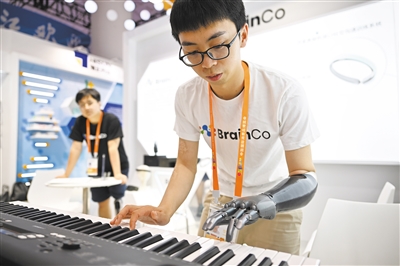 | An exhibitor is playing digital piano with a smart bionic hand. |