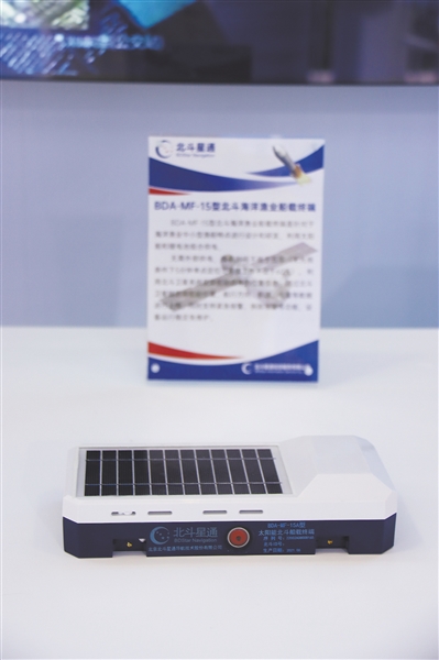 | This marine fishery shipboard terminal is powered by a combination of solar energy and lithium batteries, using the Beidou Navigation Satellite System to locate ship positions. |