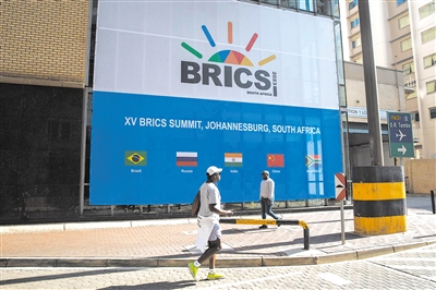 | People walk past a banner outside the venue for the 2023 BRICS Summit at the Sandton Convention Centre in Sandton, Johannesburg, on August 20, 2023. The BRICS countries meet for three days for a summit in Johannesburg starting August 22, 2023. (PHOTO: VCG) |