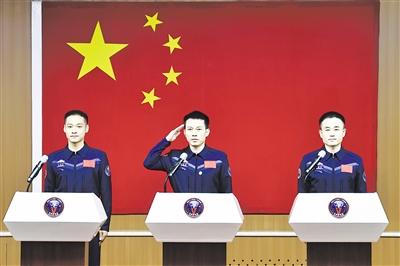Chinese astronauts Tang Hongbo (C), Tang Shengjie (R) and Jiang Xinlin for the upcoming Shenzhou-17 spaceflight mission meet the press at the Jiuquan Satellite Launch Center in northwest China on Oct. 25, 2023. (PHOTO: XINHUA)