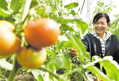 | A woman picks tomatoes at a greenhouse in Huimin county, east China's Shandong province. The local specialized fruit and vegetable planting cooperatives have greatly help villagers increase their income. (PHOTO: XINHUA) |