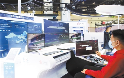 | A visitor learns the operating process of an intelligent mining production platform at the exhibition of the 2023 World 5G Convention in central China's Henan province. (PHOTO: Zhou Weihai / S&T Daily) |
