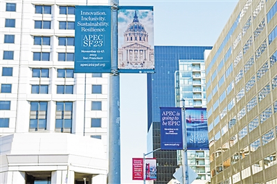 | The APEC 2023 signs in front of the APEC 2023 International Media Center in San Francisco, the United States. (PHOTO: XINHUA) |