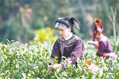 | Tea farmers dressed in local costumes pick green tea leaves in Guizhou province, southwest China. (PHOTO: VCG) |