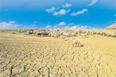 | Sheep are seen grazing in the Guadalteba reservoir, which is at the minimum water level, as a result of the severe drought in Spain in recent years. (PHOTO: VCG) |